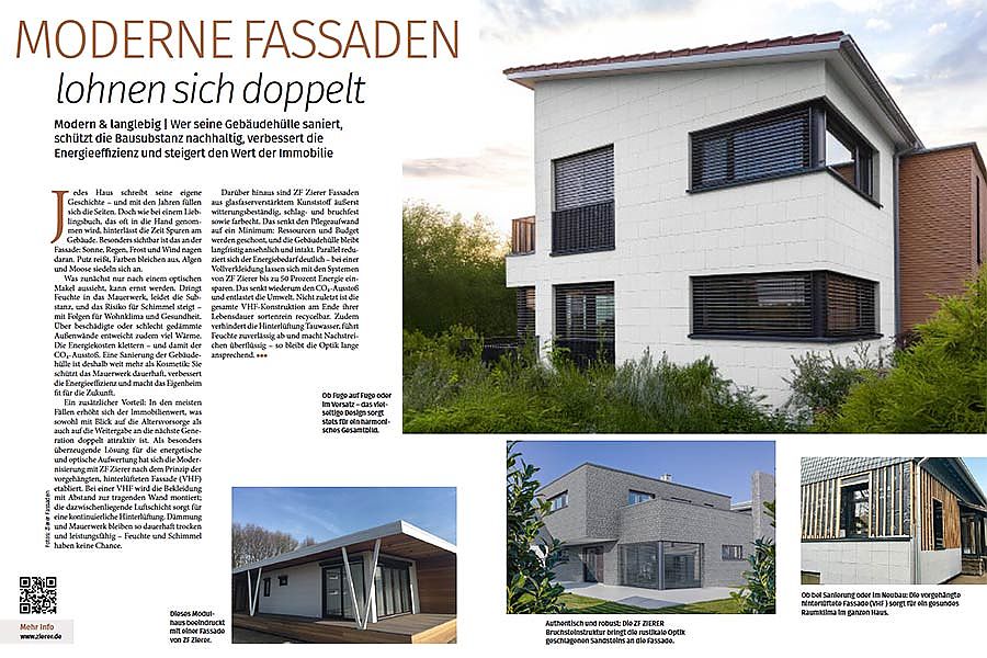 Ein zusätzlicher Vorteil: In den meisten Fällen erhöht sich der Immobilienwert, was sowohl mit Blick auf die Altersvorsorge als auch auf die Weitergabe an die nächste Generation doppelt attraktiv ist. Als besonders überzeugende Lösung für die energetische und optische Aufwertung hat sich die Modernisierung mit ZF Zierer nach dem Prinzip der vorgehängten, hinterlüfteten Fassade (VHF) etabliert. Bei einer VHF wird die Bekleidung mit Abstand zur tragenden Wand montiert; die dazwischenliegende Luftschicht sorgt für eine kontinuierliche Hinterlüftung. Dämmung und Mauerwerk bleiben so dauerhaft trocken und leistungsfähig – Feuchte und Schimmel haben keine Chance.